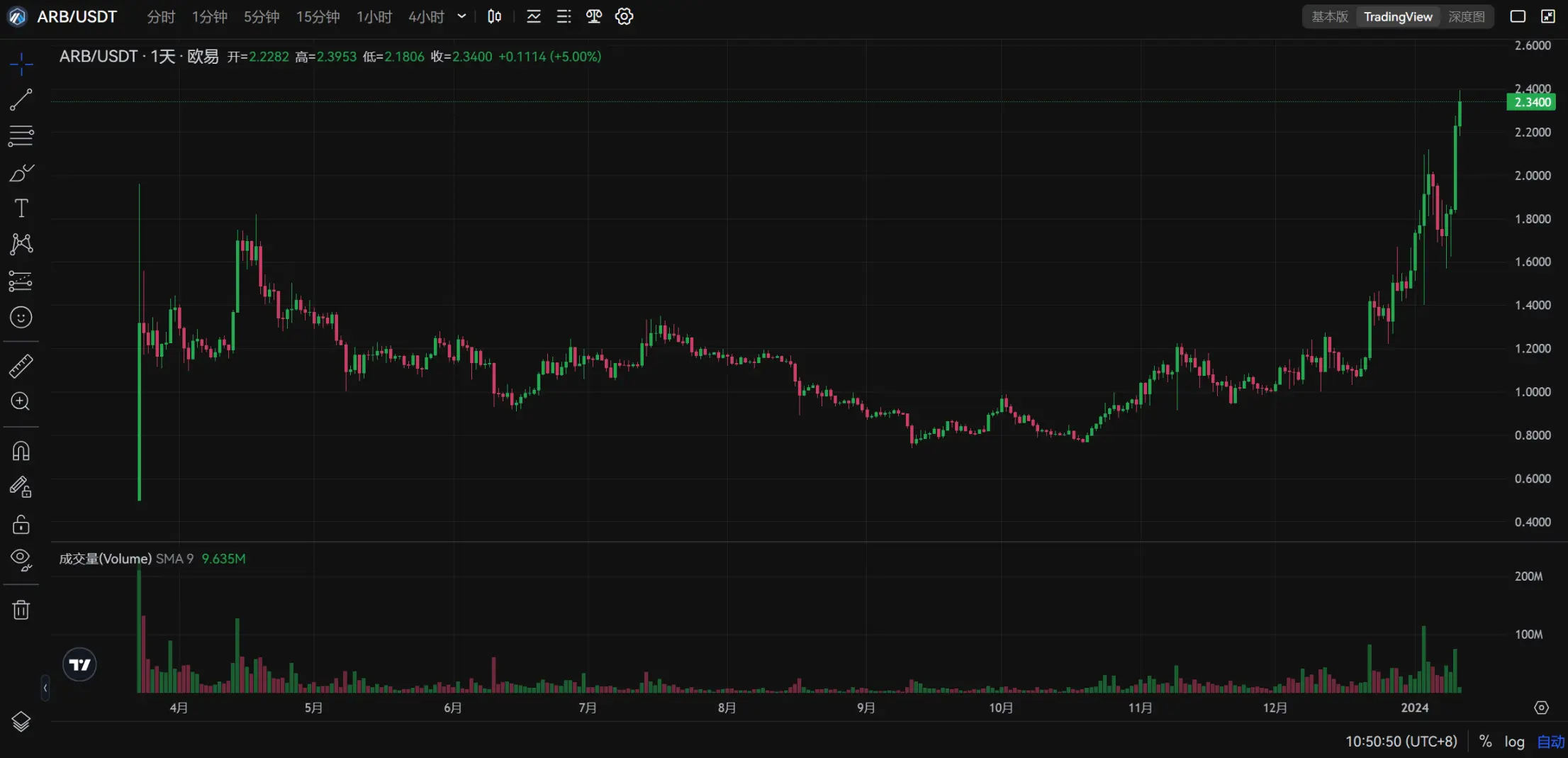 The first is naturally the Layer 2 sector. As of the time of publication, ARB has successfully exceeded 2.3 USDT (OKX spot data, the same below), setting new historical highs continuously.