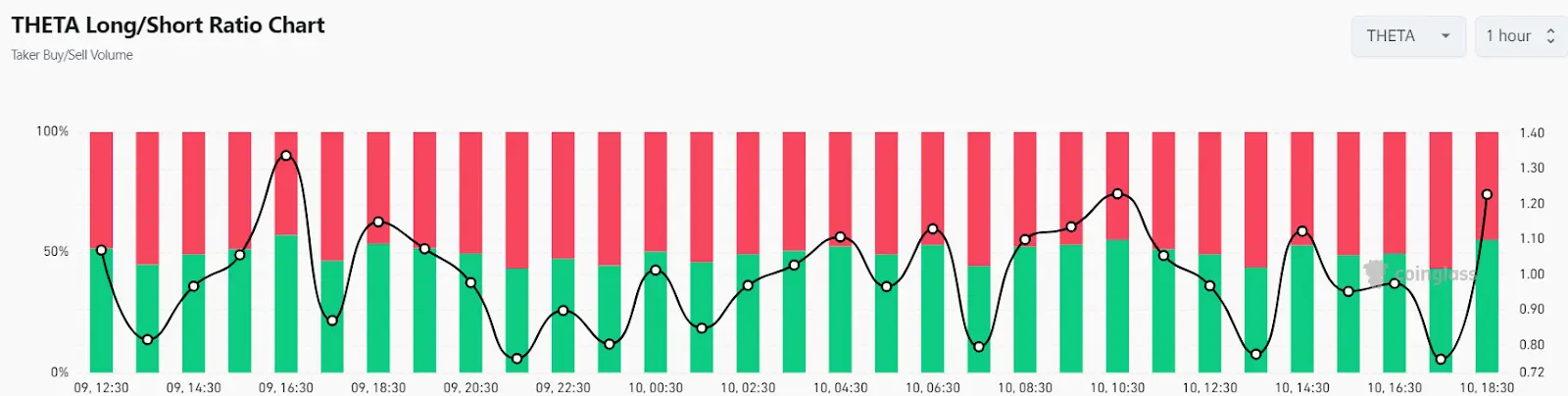 However, the long/short ratio is currently turning bullish as the ratio now trades above 1, currently trading at 1.2277. This suggests that bullish dominance is currently surging as 55% of total positions now expect a surge in Theta coin price chart.