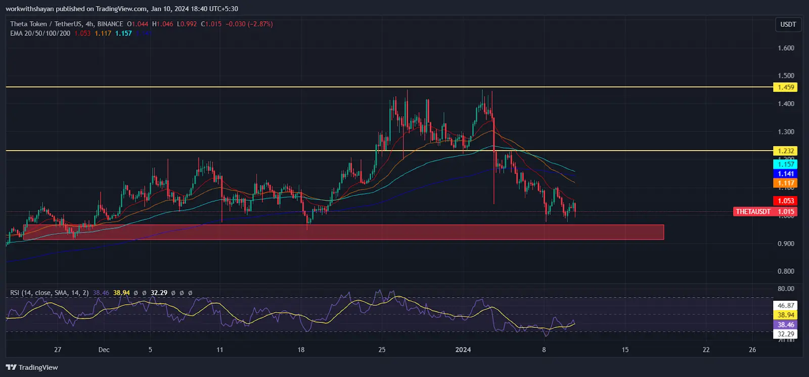 The bulls are likely to attempt halting this downward trend at the 20-day EMA (Exponential Moving Average), valued at $1.052. However, bears continue to defend this level. A robust rebound above the 20-day EMA would imply that the market sentiment is still bullish and traders are seizing the opportunity to buy during these dips. Following this, the bulls might try to drive the Theta price towards the moving averages and hold above $1.2.