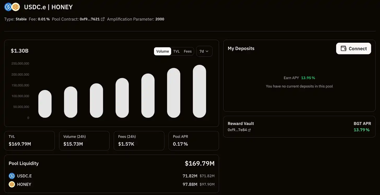 Berachain’s native DEX offers some interesting opportunities, such as the USDC.e/HONEY pool, which currently pays out a yield of 13.79% in the form of BGT. BGT is a soulbound token (non-transferable) but can be burned at a 1:1 ratio to exchange for BERA. Miners can choose to sell immediately for their current APR, or accumulate BGT and bet on the future development of the Berachain ecosystem, which has been heating up lately.