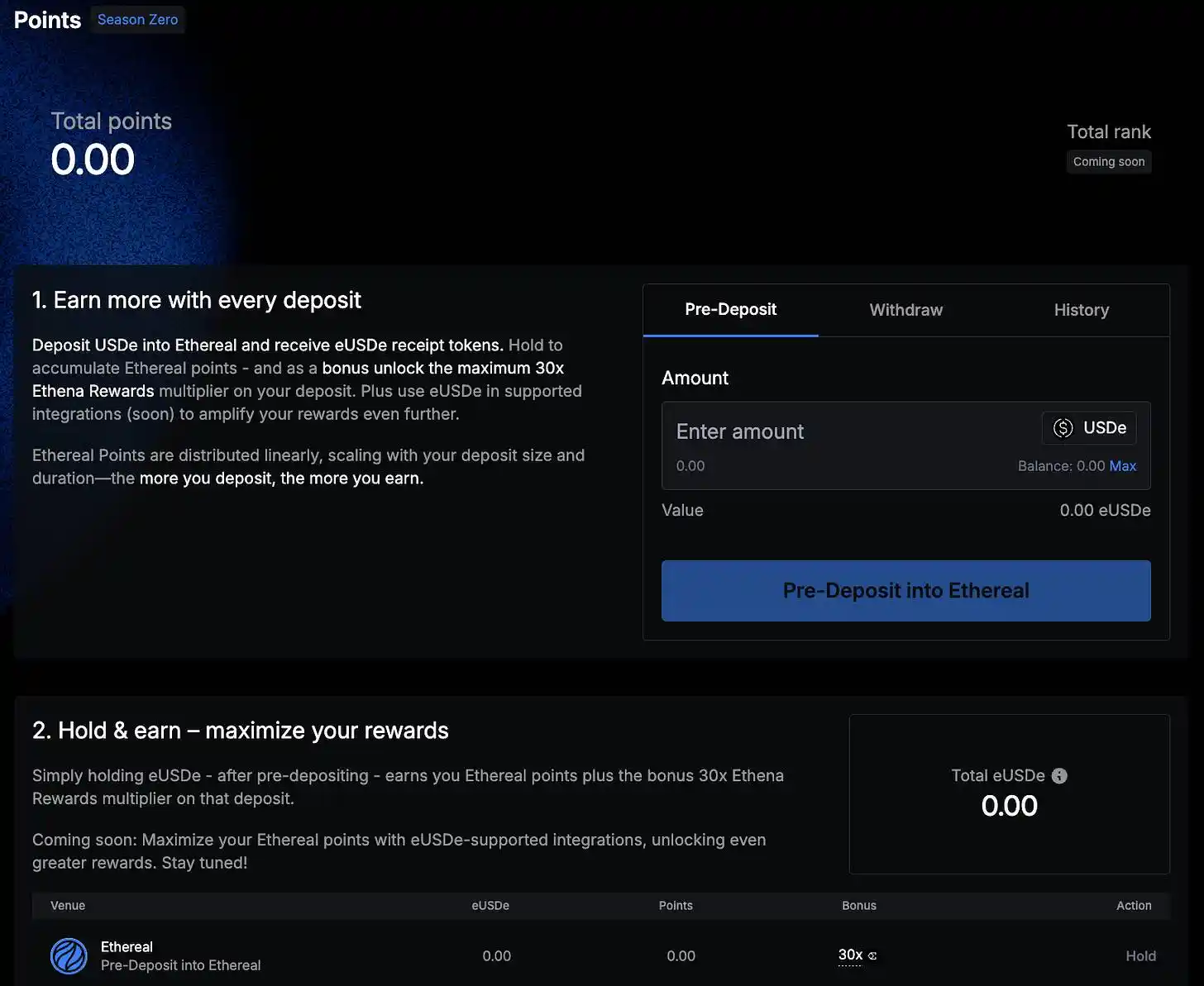 Currently, Ethereal is running a points campaign called “Season Zero”, where users who deposit USDe can accumulate Ethereal points and earn 30x their Ethena rewards (the exact benchmark is not yet known, but it can be assumed that some of the $ENA tokens will be rewarded to depositors).