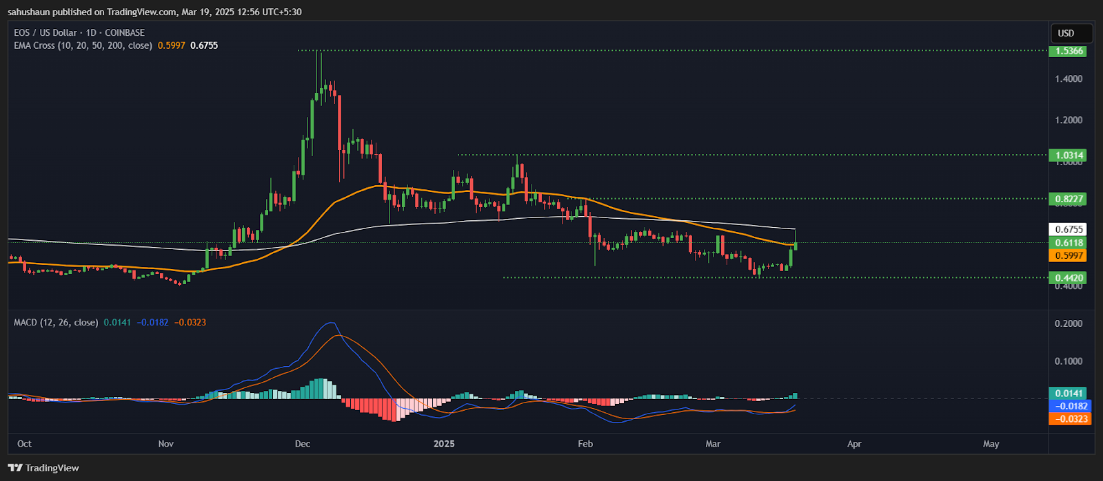 EOS price broke above the 50-day EMA mark showing strength on the charts.