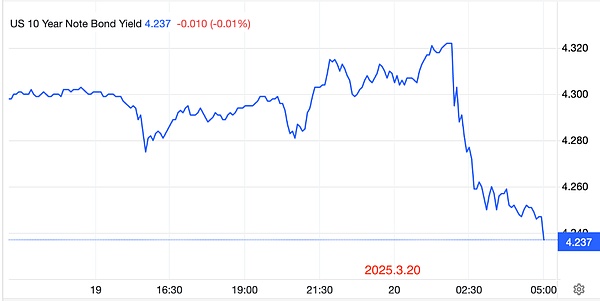 The effect is immediate. U.S. Treasury yields fell in response, breaking through the 4.3 mark, dropping from 4.32 all the way down to around 4.23.