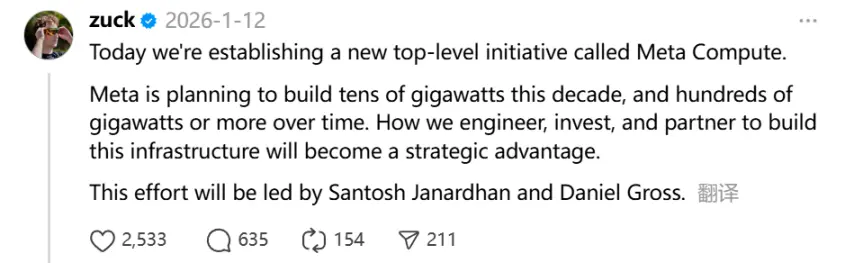 More strategically, Meta is re-evaluating its computing power and infrastructure investments. On January 12, Zuckerberg personally posted about launching a new top-tier strategic project called Meta Compute. According to disclosed information, Meta plans to invest at least $600 billion in data centers and related infrastructure in the US before 2028.