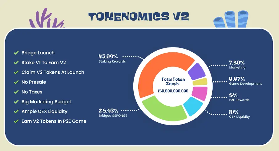 The token is bridging from V1 to V2 soon. As part of this, users can stake their $SPONGE to earn Sponge V2 tokens with attractive bonuses.