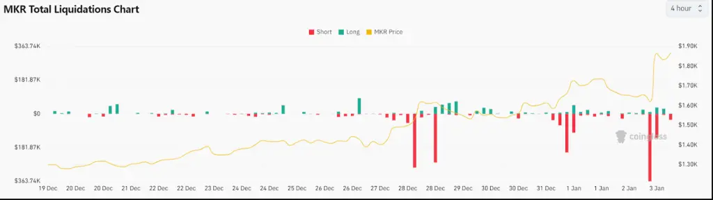 According to Coinglass data, there has been a notable spike in liquidations as a result of Maker’s hike from a minimum of $1,826 to a maximum of $1,928.