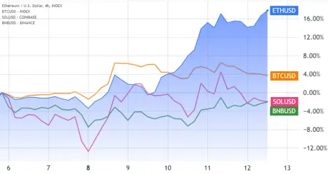 Ether/USD vs. BTC/USD, SOL/USD, and BNB/USD. Source: TradingView