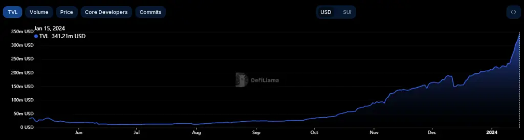 Over the course of the past week, the Sui network has witnessed an exponential increase in its TVL, reaching an astonishing figure of nearly $350 million. This achievement holds particular significance considering the relative youth of the platform in the competitive crypto landscape.