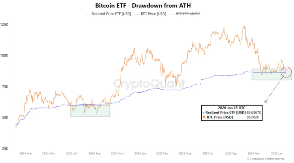 Segundo indicador: preço realizado do ETF em 86.600 dólares como nível psicológico. Dados on-chain da CryptoQuant mostram que o Bitcoin oscila próximo ao preço realizado de 86.600 dólares, que é a média de custo dos investidores no ETF. Desde outubro de 2025, as participações no ETF diminuíram mais de 6 bilhões de dólares, uma redução de 8% em relação ao pico, indicando que esse grupo de investidores relativamente novo está passando por um teste de resistência importante. Analistas descrevem essa região como um ponto de inflexão psicológico, pois manter-se acima reforça a confiança e estabiliza o fluxo de fundos, enquanto negociar abaixo dessa zona historicamente acelera resgates.