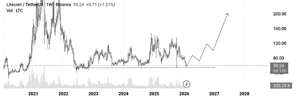 Com o Litecoin a negociar por volta de $59, o preço está exatamente naquela faixa de $55–$60 que continua a aparecer como uma linha que os compradores estão dispostos a proteger. Este não é um nível novo que surgiu na semana passada. É uma zona que foi testada em várias fases do mercado, e é por isso que está a começar a importar novamente.