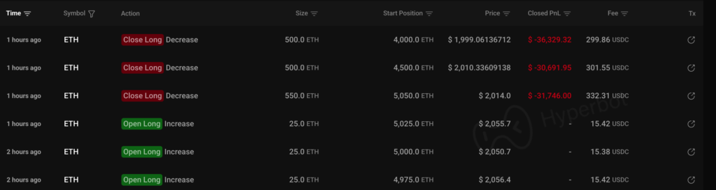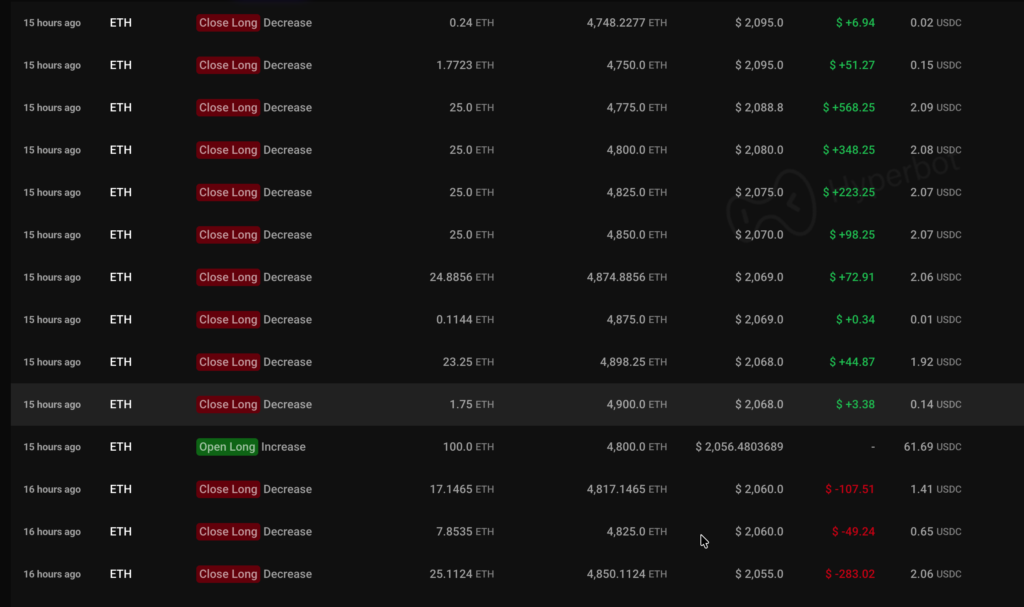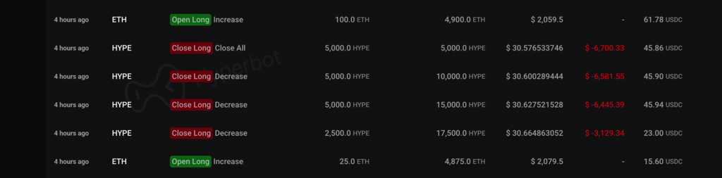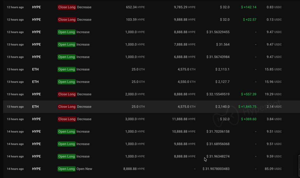 Não foi apenas o ETH; sua posição em HYPE (token nativo do Hyperliquid) também não escapou. Segundo dados de monitoramento, ele abriu posições longas em HYPE na madrugada de ontem, chegando a um pico de 17.500 unidades. Mas, cerca de quatro horas antes da redução de ETH, ele liquidou sua posição em HYPE, registrando um prejuízo de 22.857 dólares.