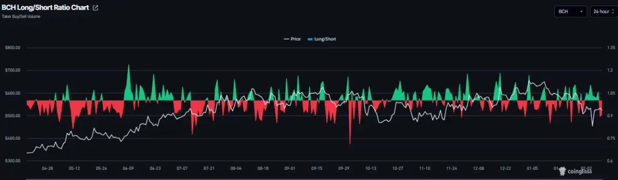 Os dados do mercado de derivativos do Bitcoin Cash estão emitindo sinais pouco encorajadores. Segundo CoinGlass, a relação long/short do BCH na terça-feira atingiu apenas 0,90. Manter esse índice abaixo de 1 indica que o sentimento pessimista está predominando, com a maioria dos traders inclinada a posições de venda e apostando na queda do preço.