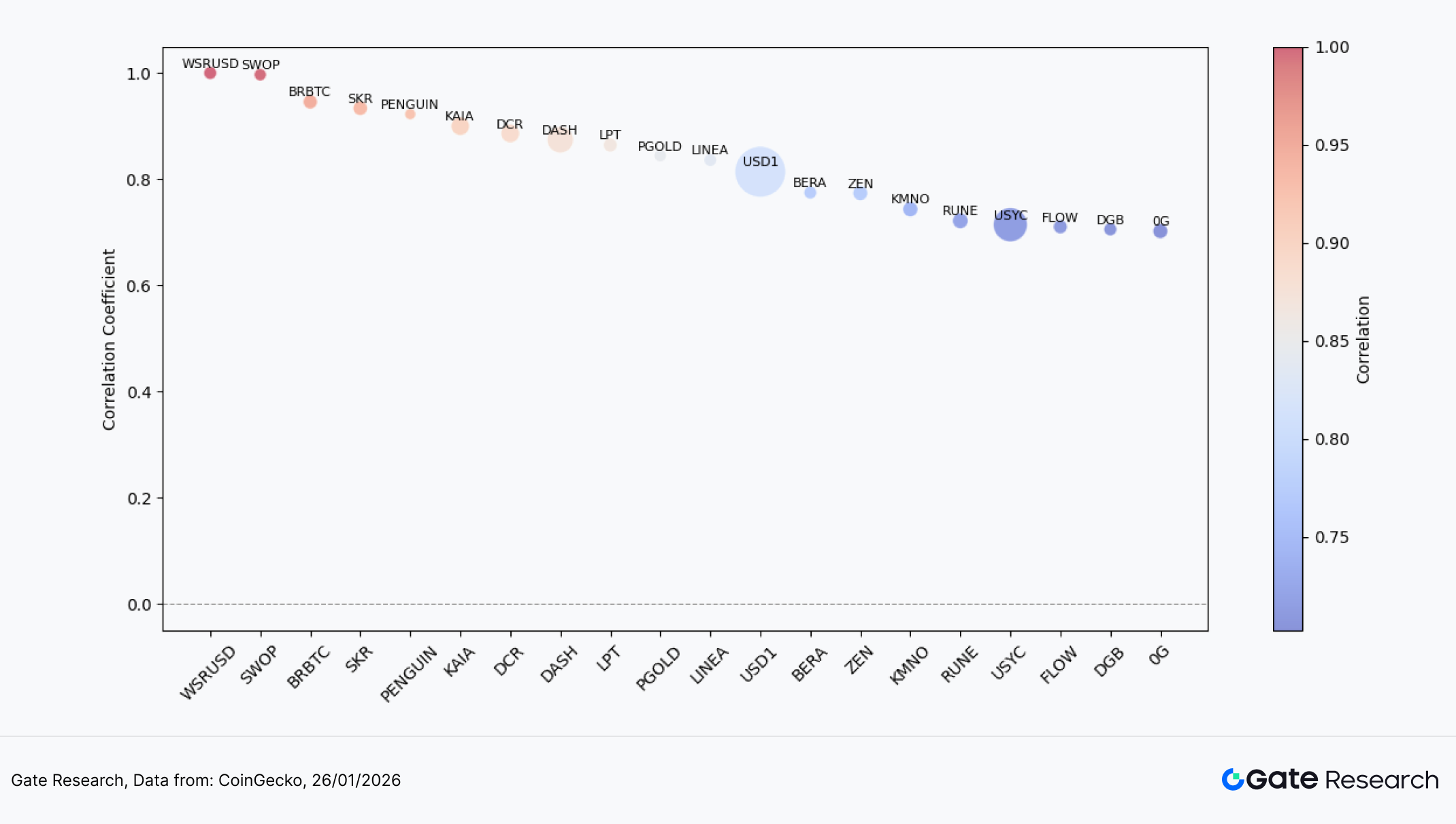 O gráfico mostra que a maioria dos tokens apresenta correlações entre 0,7 e 0,9, indicando que o mercado permanece fortemente orientado pela liquidez — a expansão de volume é frequentemente acompanhada por movimentos de preço, sendo o sentimento e a liquidez determinantes nas tendências de curto prazo.