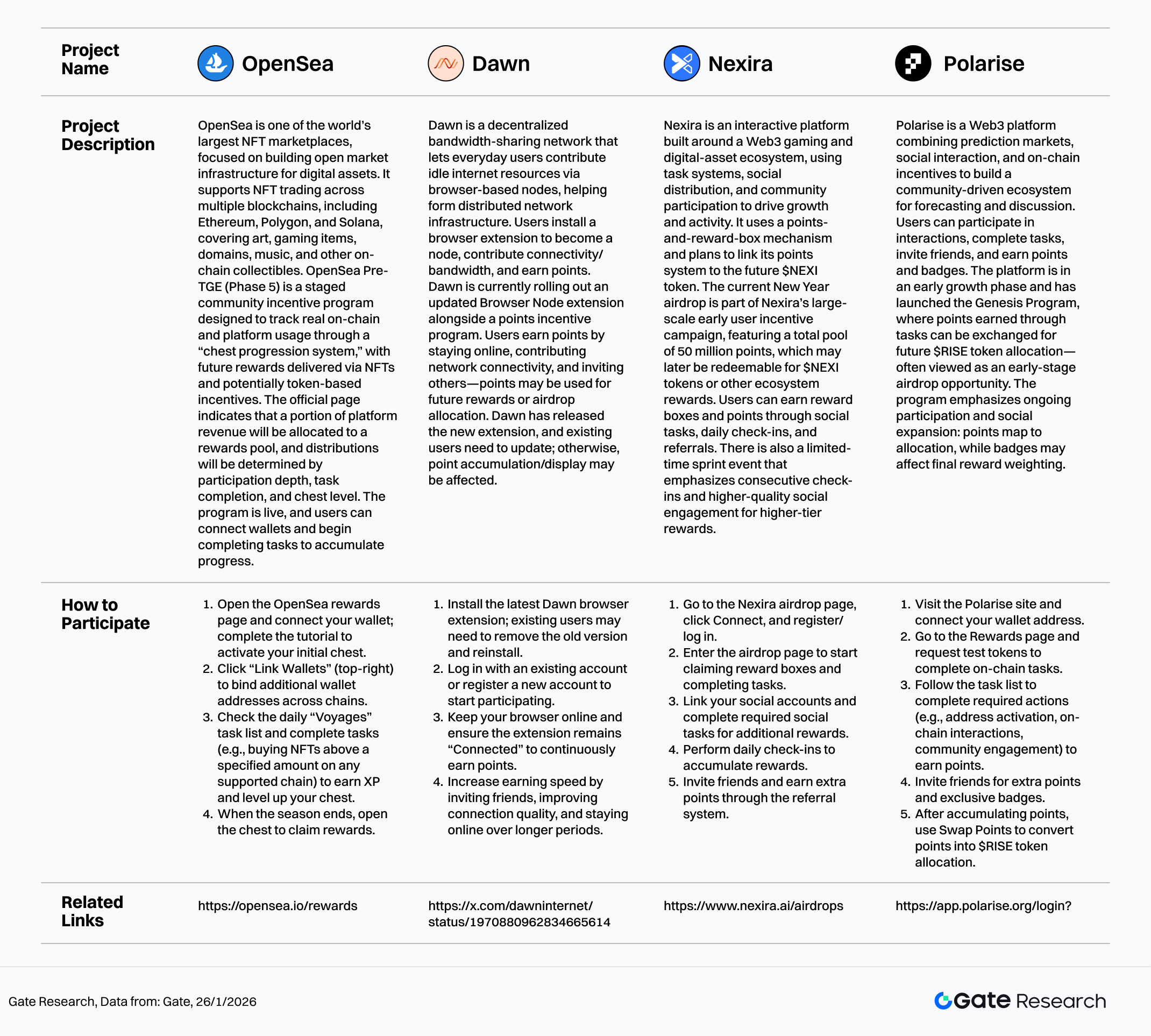 Este relatório identifica vários projetos com potencial de airdrop a acompanhar entre 13 e 26 de janeiro de 2026: OpenSea (marketplace NFT), Dawn (rede de partilha de largura de banda via browser), Nexira (plataforma Web3 interativa) e Polarise (ecossistema baseado em pontos que combina mercados de previsão com incentivos sociais). Os utilizadores podem acumular pontos e registos de contribuição ao ligar carteiras, manter nós online, concluir tarefas on-chain e sociais, convidar amigos e participar em check-ins diários, aumentando assim o peso e a elegibilidade para futuras alocações de airdrop ou incentivos em tokens.