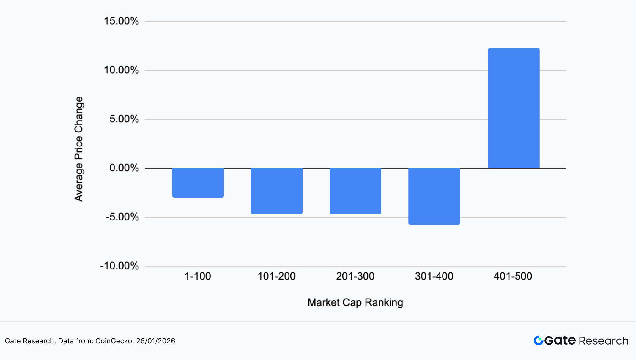 Para analisar as caraterísticas estruturais do desempenho dos tokens nesta fase de mercado, este relatório apresenta um gráfico de dispersão dos 500 principais tokens por capitalização. O eixo horizontal representa o ranking de capitalização (maiores à esquerda), enquanto o vertical mostra o desempenho de preço entre 13 e 26 de janeiro. Cada ponto representa um token, verde para ganhos e vermelho para perdas.