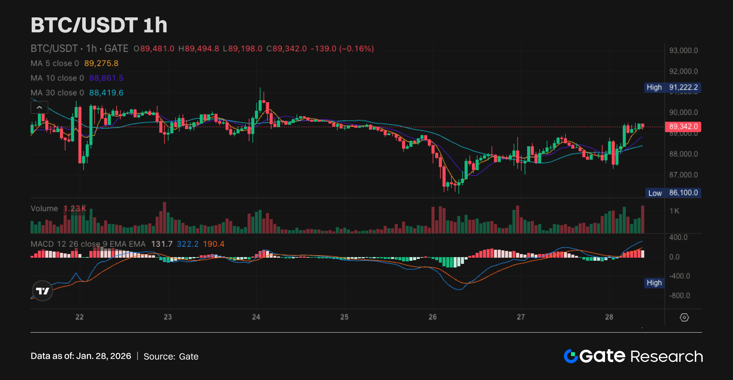O BTC apresentou uma recuperação instável no último dia, oscilando repetidamente entre 88 800 e 89 800 USDT. O movimento de recuperação após a queda acentuada do dia 26 mantém-se, mas persiste pressão de oferta. A configuração das médias móveis tornou-se positiva, com MA5, MA10 e MA30 a formarem um alinhamento ascendente e o à vista a negociar acima das três, sugerindo força de curto prazo, embora ainda numa fase de reparação. O MACD está acima da linha zero e mantém cruzamento dourado, com barras vermelhas em expansão, indicando reforço do ímpeto de alta. No geral, se o BTC se mantiver acima dos 89 000 USDT e romper os 90 000 USDT com volume mais forte, pode voltar a testar a zona de máximos anterior perto dos 91 200 USDT; se falhar e descer abaixo da banda de suporte 88 800–88 400 USDT, será importante vigiar sinais de exaustão da recuperação e possível correção para os 87 000 USDT.