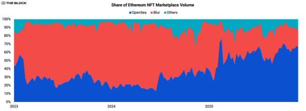 No início de 2025, a OpenSea detinha cerca de 36% do volume de negociação no mercado de NFT Ethereum/EVM, enquanto a Blur tinha 58%. No final do ano, a quota da OpenSea superava os 67%, enquanto a da Blur caía para menos de 24%. Apesar da descida do volume global, o valor negociado em NFT na OpenSea cresceu dois dígitos em termos anuais, ultrapassando 1,4 mil milhões de dólares. Em contraste, o volume anual da Blur caiu mais de 73%.