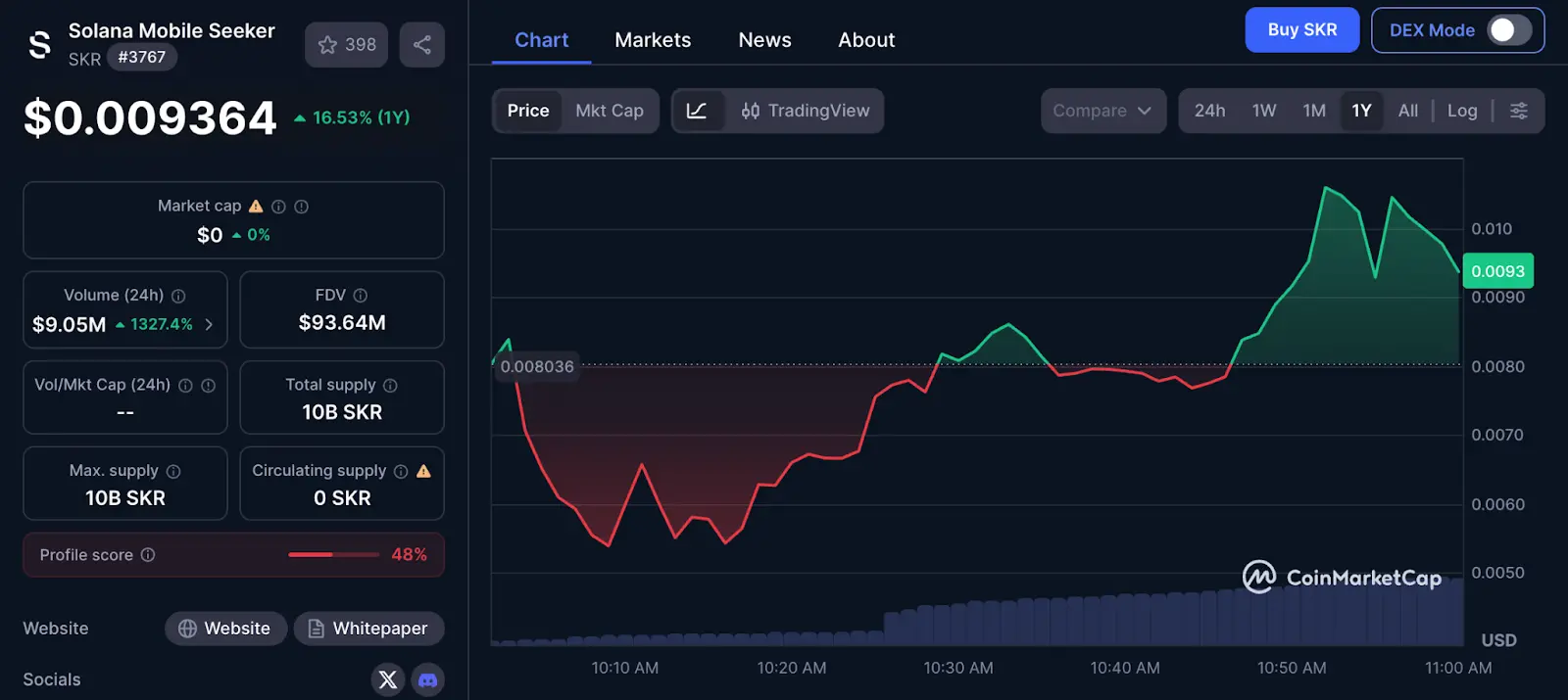 Os dados revelam que o SKR negociou entre 0,006$ e 0,01$ na primeira hora. Ao preço atual, em torno de 0,0095$, os detentores do escalão de entrada Scout receberam um airdrop de 47,5$, enquanto os do escalão máximo Sovereign receberam 7 125$. Face ao custo original de pré-venda do Seeker, entre 450$ e 500$, o retorno máximo superou 14 vezes.