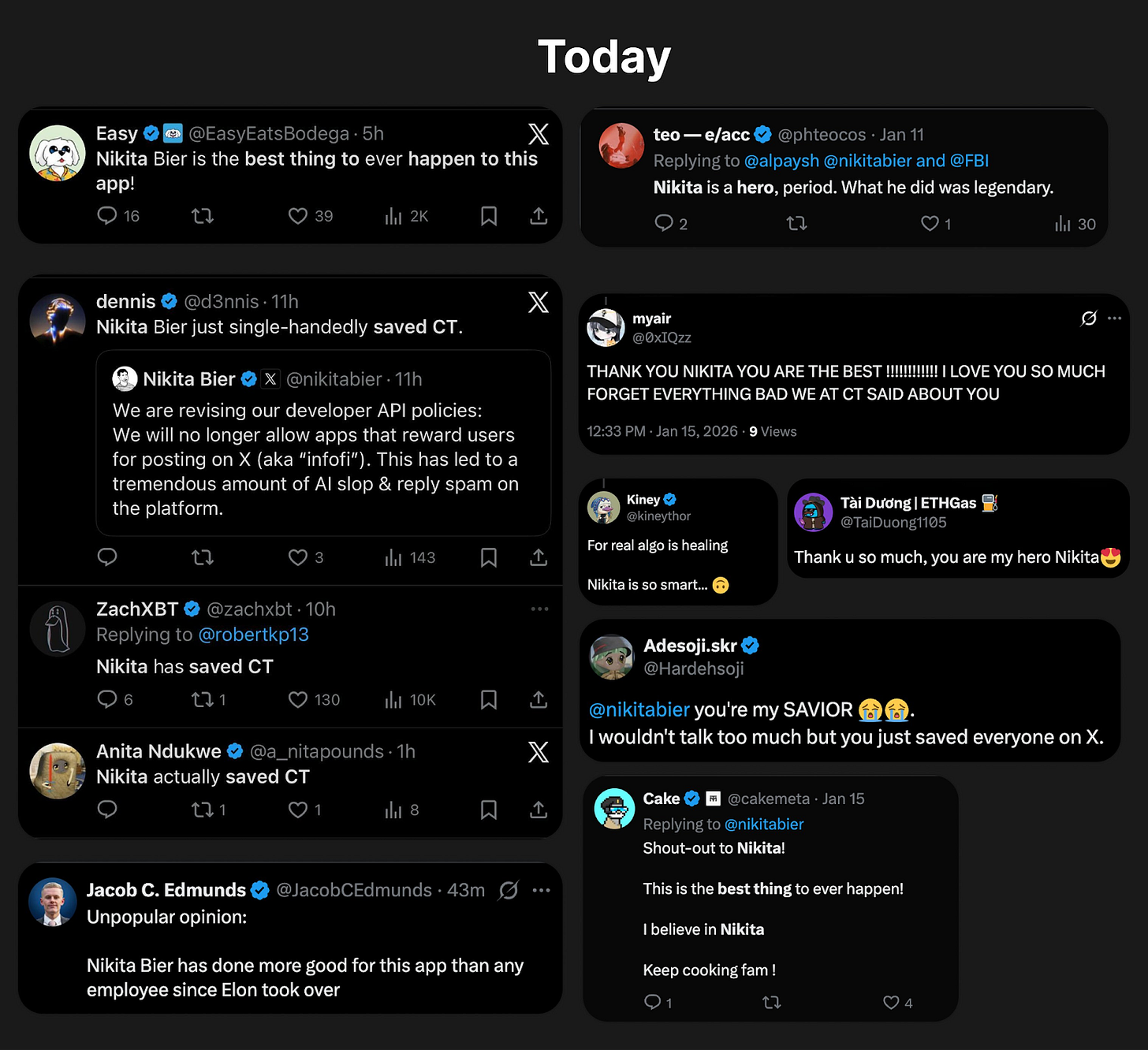 No dia 15 de janeiro, Nikita Bier, responsável de produto da X, publicou um curto post a informar que aplicações que ofereçam recompensas em troca de publicações deixariam de ser permitidas na plataforma. Para os projetos InfoFi, isto marcou o fim.