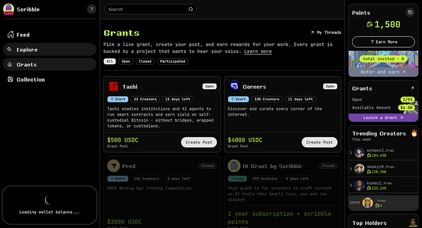 Scribble é um exemplo representativo. Os projetos publicam subsídios sob a forma de recompensas e os KOLs criam e submetem conteúdos para revisão antes de receberem as recompensas. Este é um modelo de submissão e revisão, não de acompanhamento em tempo real.