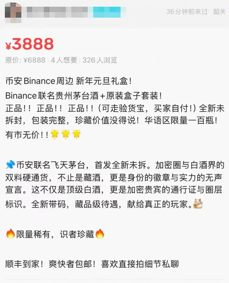 Por fim, com base nas buscas no Xianyu, o destaque vai para esta garrafa de Feitian Maotai da Binance: