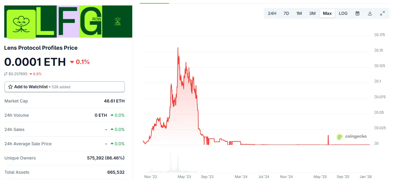 No entanto, a implementação técnica não se traduziu em uma ecossistema próspero. Segundo dados do Coingecko, atualmente, o protocolo possui 665 mil NFTs, detidos por 575 mil usuários independentes, com um valor de mercado total de 13,8 mil dólares.