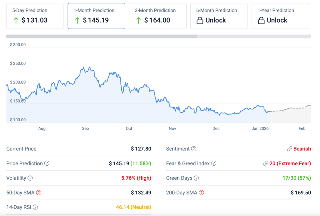 Com um preço de cerca de $127 no final de janeiro, a Solana está a consolidar-se em vez de desabar, e pode ver um ligeiro aumento até cerca de $145.20 no próximo mês, dependendo de o sentimento se fortalecer ou não.
