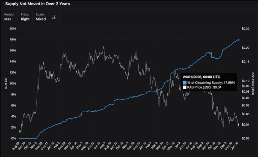 Isto significa que quase um quinto de todo o KAS em circulação permaneceu intocado por mais de dois anos. Em termos simples, uma parte crescente do mercado já não está a negociar ou a reagir a movimentos de preço de curto prazo. Essas moedas estão a ser mantidas com uma perspetiva de longo prazo.