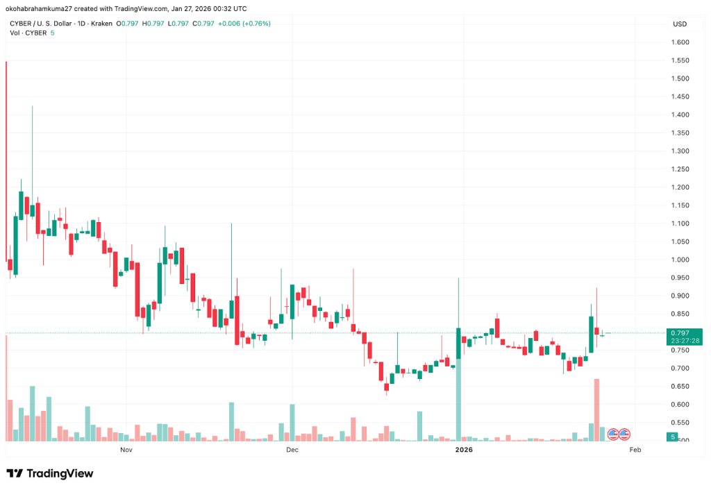 Cyber emergiu como um concorrente resiliente entre as escolhas do setor de IA. Com um aumento de preço de 10% nas últimas sete dias até 26 de janeiro, o Cyber está superando o mercado global de criptomoedas, que caiu 5%. Esse momentum positivo sugere que os investidores estão realocando capital para plataformas de contratos inteligentes que oferecem escalabilidade e utilidade social.