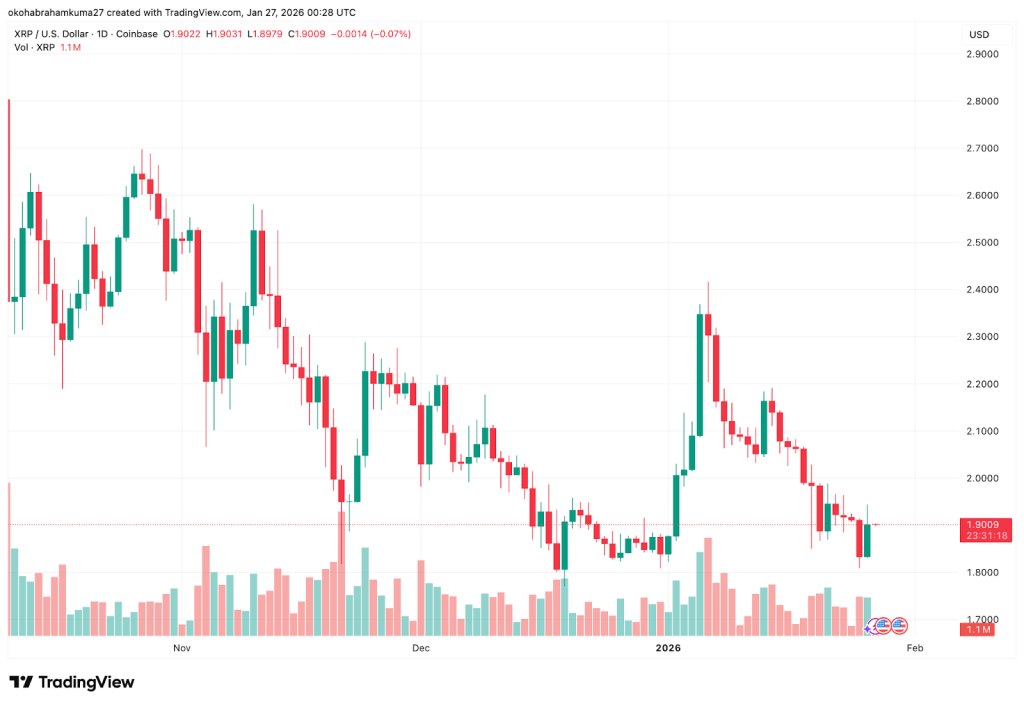 A perspetiva atual do preço do XRP é uma mistura de resiliência e estagnação. O XRP registou uma queda de 3% nos últimos sete dias até 26 de janeiro, o que, embora negativo, está a superar a queda de 5% do mercado. O volume de negociação do XRP explodiu para mais de $3,6 mil milhões nas últimas 24 horas, representando um aumento de 105,30%.