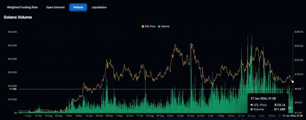 No entanto, as notícias positivas sobre Solana não afetaram a ação do preço do SOL. No momento da publicação, o ativo cripto negociava perto de $125, uma queda de 5% na última semana. A atividade de negociação também diminuiu durante a retração, com o volume spot a cair 9,5% para $11,4 bilhões, de acordo com a CoinGlass.