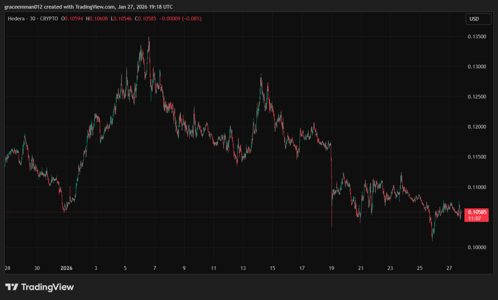 A previsão de preço do HBAR mudou para um tom mais cauteloso. Os compradores anteriormente empurraram o preço para a zona de $0.13, mas o momentum desapareceu rapidamente ali.