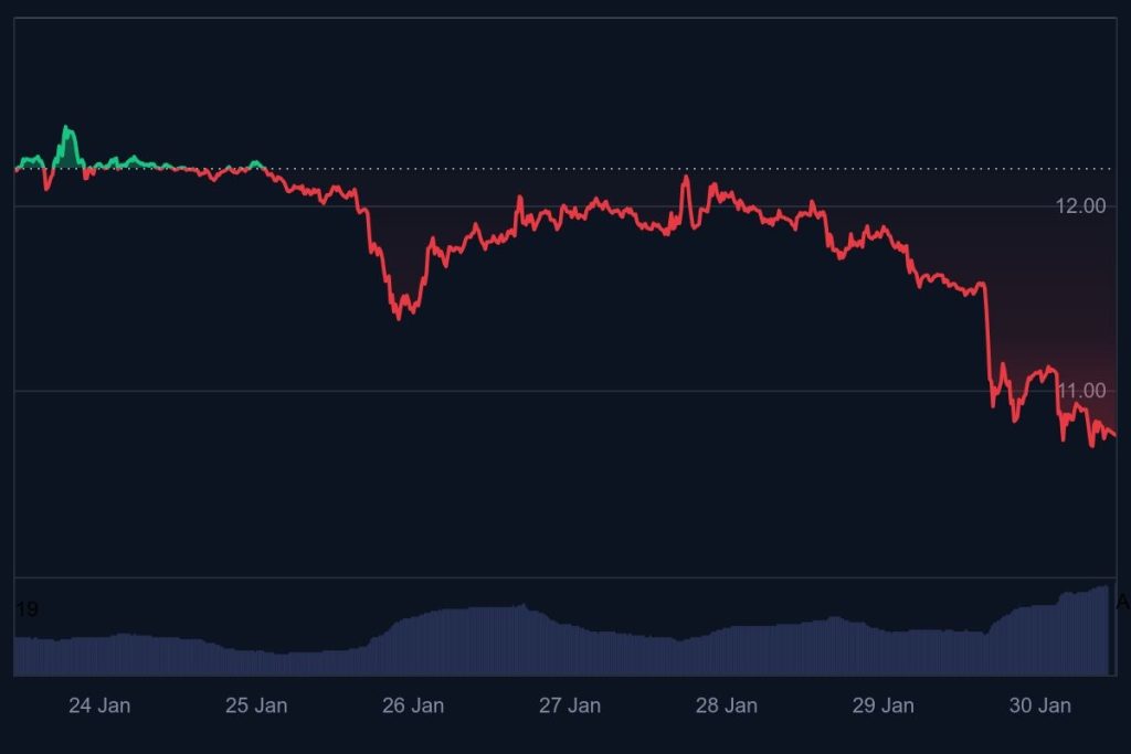 O token nativo do Chainlink não foi imune à queda mais ampla do mercado nesta semana. Depois de negociar a $12,20 em 24 de janeiro, o LINK caiu para $10,76 em 30 de janeiro, representando uma queda de 12% em seis dias.