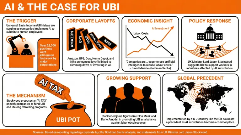 Stockwood sugeriu que o UBI poderia ser uma solução para apoiar trabalhadores em indústrias impactadas pela IA, enfatizando a necessidade de requalificação.