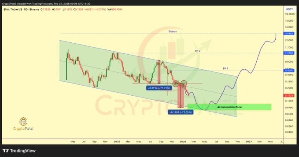 O principal analista Crypto Patel partilhou um gráfico que mostra o preço do ENA a mover-se dentro de um longo canal descendente que tem estado em vigor desde 2024. O preço desceu em várias fases e agora está a pressionar contra a borda inferior dessa estrutura.