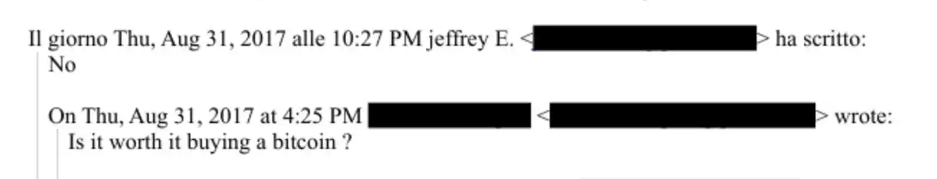 Se Epstein realmente conheceu Satoshi Nakamoto, parece que este não tentou convencer Epstein sobre o Bitcoin. Num email de 31 de agosto de 2017, Epstein respondeu de forma direta à questão “vale a pena comprar um Bitcoin?” com um simples “Não”. Na altura, um Bitcoin valia menos de 5.000 dólares.