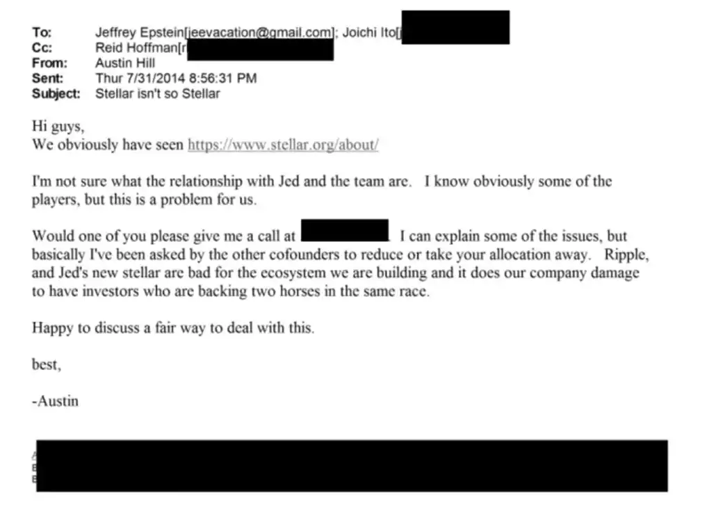 Além disso, Austin Hill enviou em 2014 um email a Epstein e a Joi Ito (ex-diretor do MIT Media Lab, que investiu na Blockstream através do seu fundo), dizendo que Ripple ($XRP) e Stellar (projeto do fundador da Ripple, Jed McCaleb, após deixar a Ripple) tiveram impacto negativo na ecologia construída pela Blockstream, prejudicando a empresa porque os seus investidores apoiavam “duas corridas de cavalos ao mesmo tempo”.
