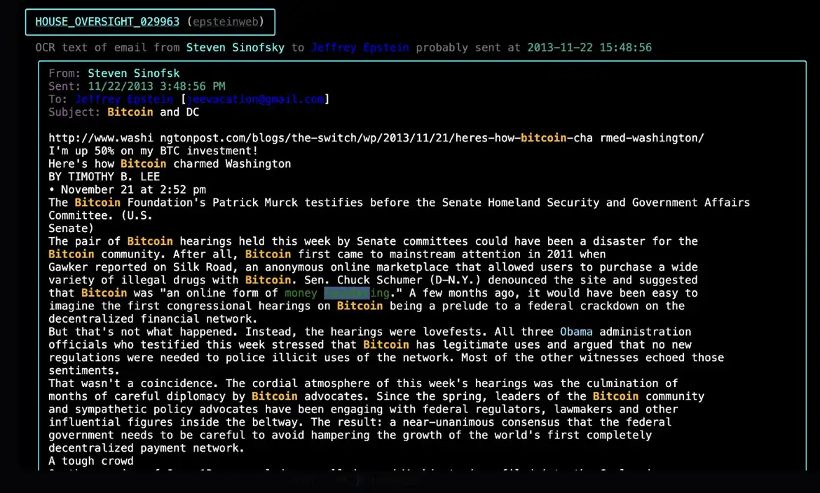 Steven Sinofsky, membro do conselho da a16z e ex-presidente do departamento Windows na Microsoft, disse a Epstein por email que o seu investimento em Bitcoin já tinha aumentado 50%, e partilhou um artigo de Timothy B. Lee “Como o Bitcoin conquistou Washington”.