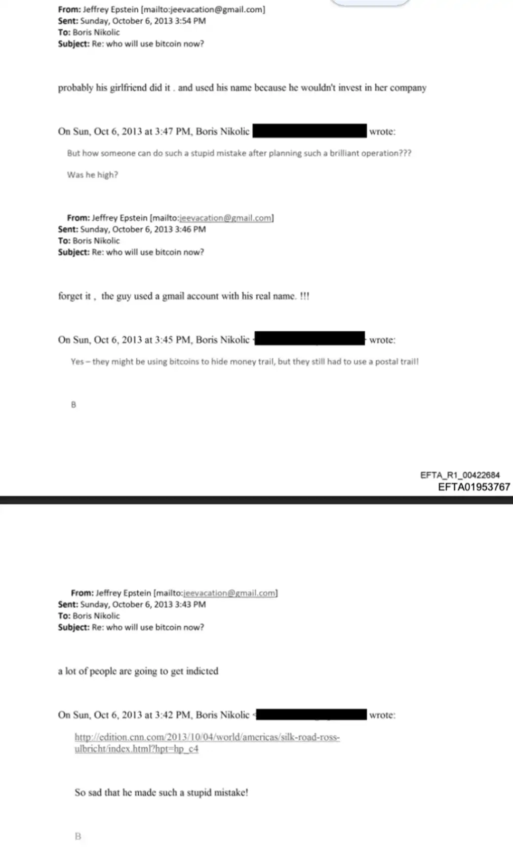 Primeiro, um email de Boris Nikolic (que foi conselheiro-chefe de tecnologia de Bill Gates e está incluído no testamento de Epstein), com o assunto “Quem ainda usa Bitcoin agora?”. Eles zombam e ridicularizam o fundador do Silk Road, Ross Ulbricht, dizendo que foi um erro usar uma conta Gmail com o nome verdadeiro.