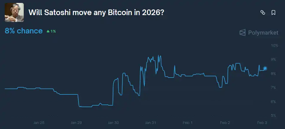 Após a divulgação destes últimos ficheiros Epstein, a probabilidade de o mercado prever que “Satoshi Nakamoto movimentará o seu Bitcoin em 2026” subiu de cerca de 6% para cerca de 9,3%, atualmente estabilizada em 8%.