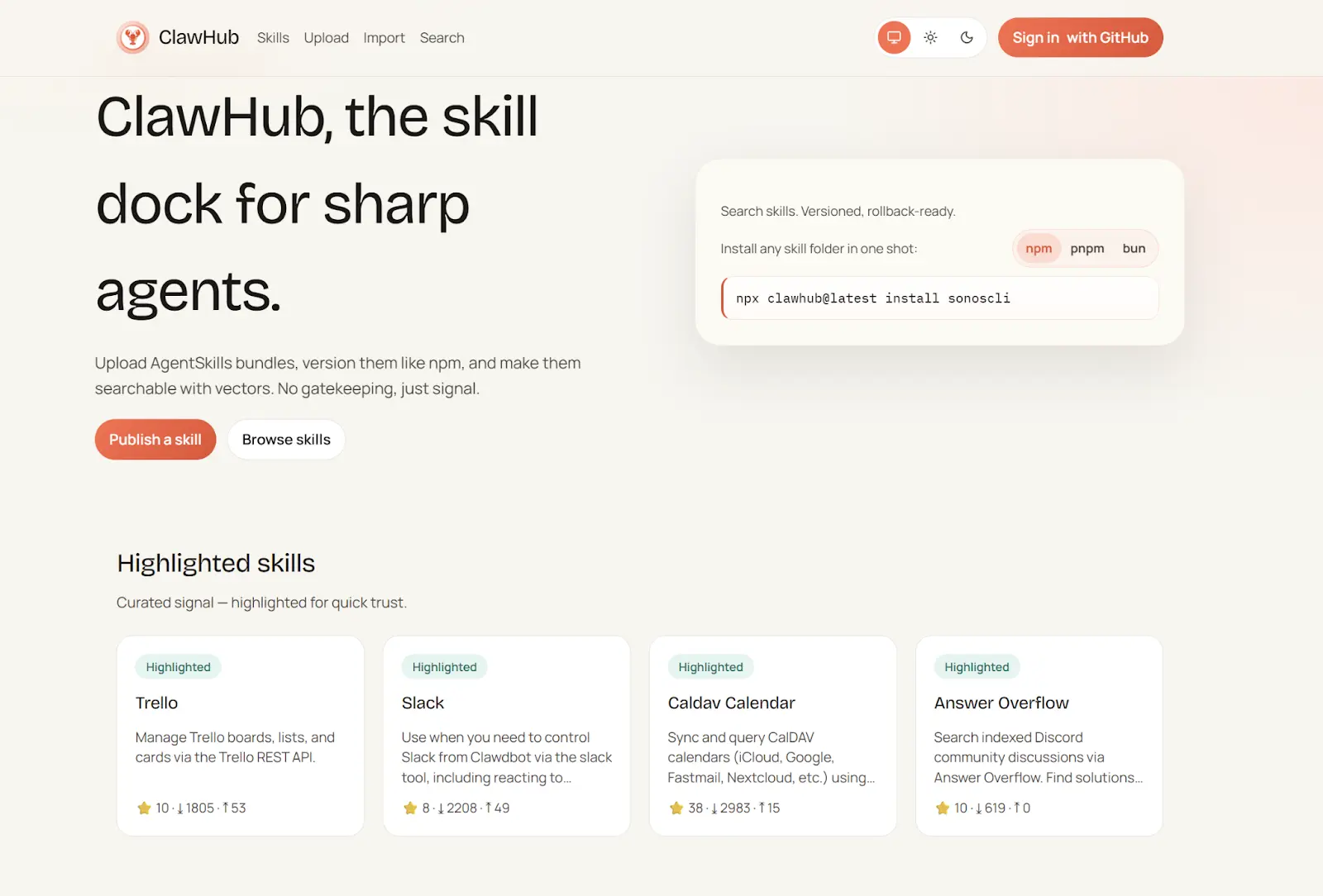 No que diz respeito à expansão de Skills, está surgindo uma espécie de “App Store de IA” — o ClawHub, um marketplace de plugins (Skill Dock). Ele permite que usuários busquem, enviem e integrem funcionalidades facilmente, com comandos simples como npx para instalação, reduzindo a barreira técnica.
