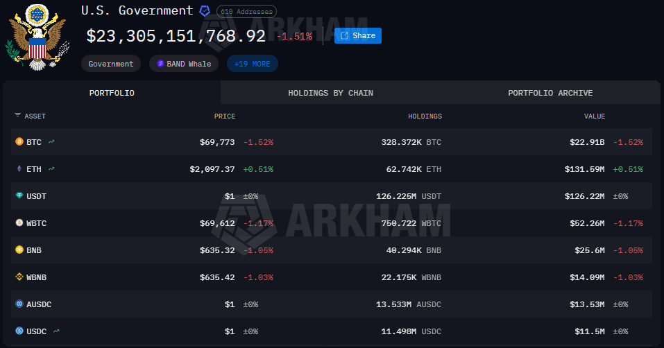 De acordo com os dados da Arkham, o valor do Bitcoin atualmente detido pelo governo dos EUA é de aproximadamente 23 bilhões de dólares, principalmente provenientes de apreensões em casos de aplicação da lei. A política atual concentra-se em parar de vender esses ativos confiscados para acumular reservas, e não em intervir ativamente no mercado aberto ou usar fundos públicos para compras, o que é uma abordagem completamente diferente.