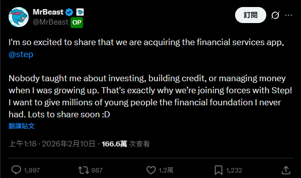 Fonte da imagem: X MrBeast adquire o banco da Geração Z, Step, e entra na tecnologia financeira