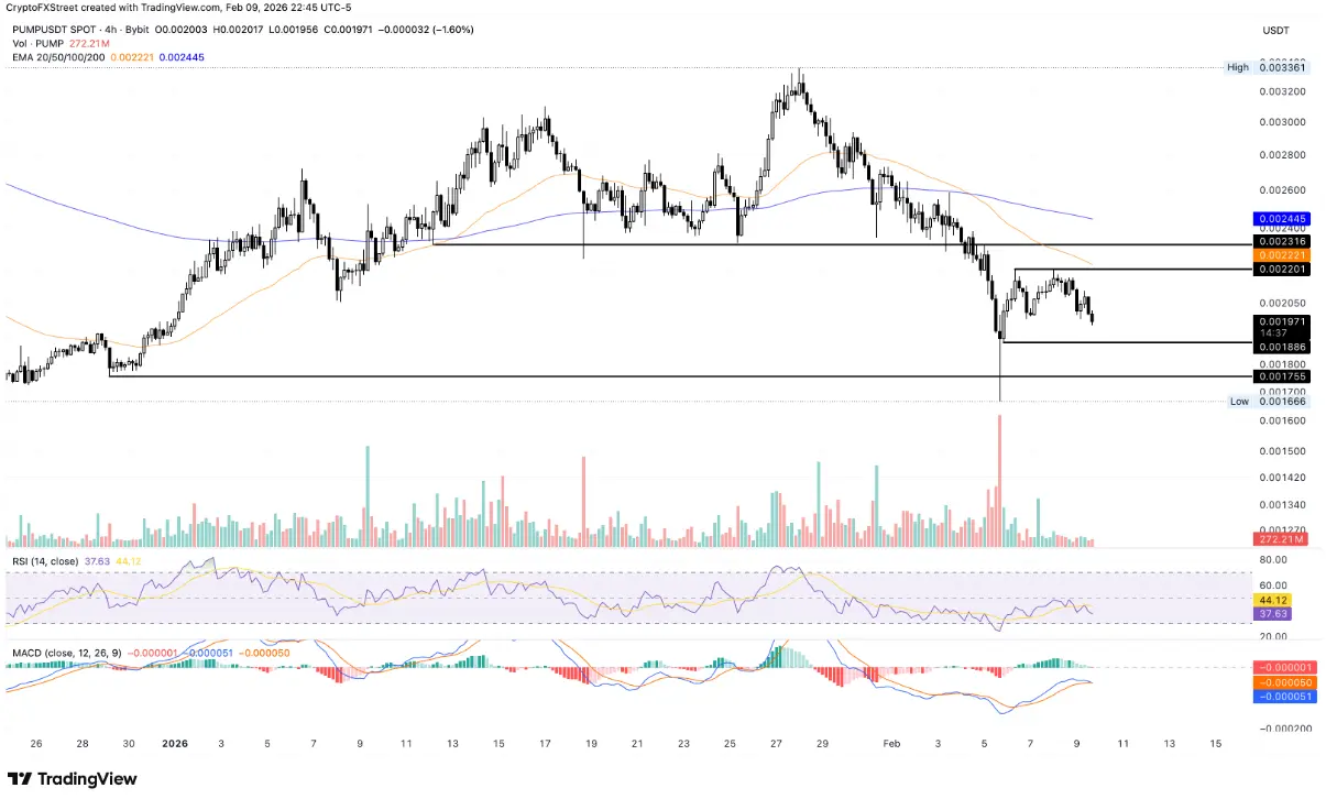 O enfraquecimento atual está levando a PUMP a se aproximar da zona de suporte em 0,001886 USD — correspondente ao fundo do candle de 4 horas formado em 5/2. Caso o preço feche claramente abaixo dessa marca no gráfico de 4 horas, a tendência de baixa provavelmente se ampliará, com o próximo alvo sendo o fundo de 29/12, em torno de 0,001775 USD.