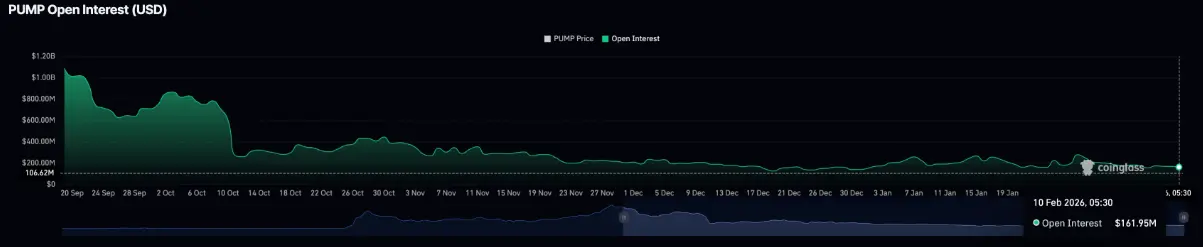 Dados de desbloqueio de PUMP | Fonte: DeFiLlamaPor outro lado, dados do CoinGlass mostram que o open interest (OI) dos contratos futuros de PUMP está em declínio contínuo, caindo para 161,95 milhões de dólares na terça-feira. Essa tendência reflete uma maior cautela e uma participação reduzida dos investidores individuais.