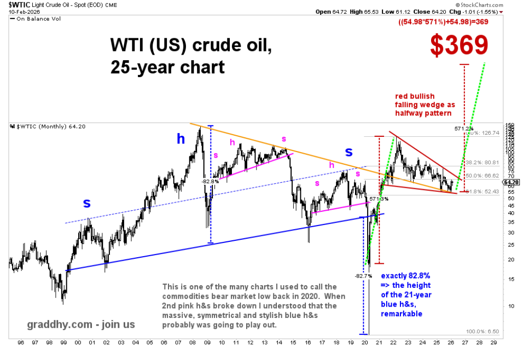A faixa atual do petróleo, perto de 64 dólares, insere-se numa cunha de baixa de 4,5 anos que Graddhy considera uma estrutura intermédia dentro de uma tendência de avanço maior. A teoria da continuação técnica trata as formações a meio caminho como linhas divisórias entre dois segmentos de expansão semelhantes. A medição da altura da cunha projeta um destino possível próximo de 369 dólares, se o segundo segmento se desenvolver com simetria.