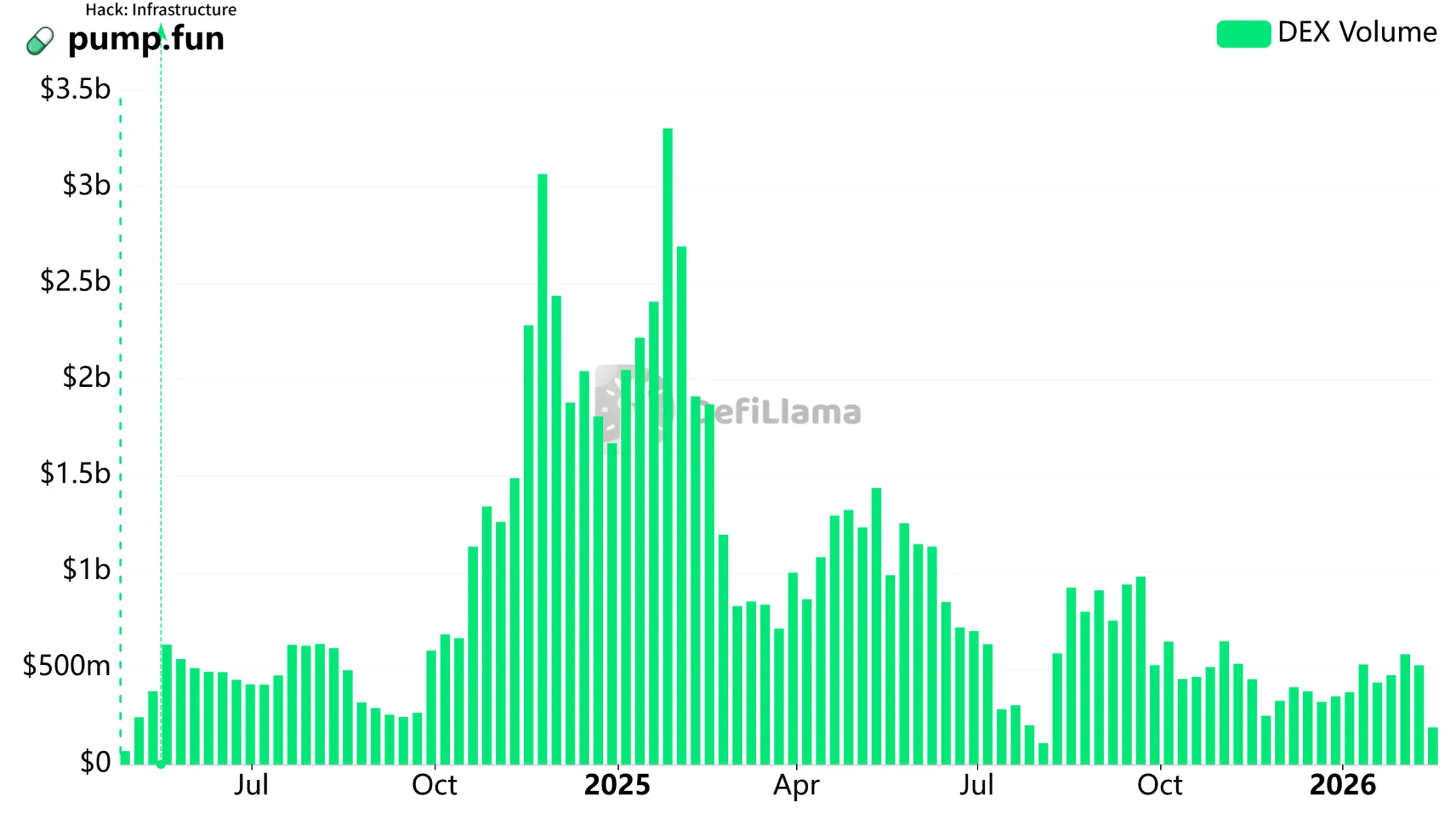 Dados do Defilama mostram que, por volta de 2025, a plataforma Meme pump.fun atingiu recordes históricos de volume de negociações, com duas semanas acima de 3 bilhões de dólares. Depois disso, houve uma queda contínua, e no início de 2026, o volume de negociações ficou na faixa de 500 milhões de dólares, cerca de um sexto do pico.