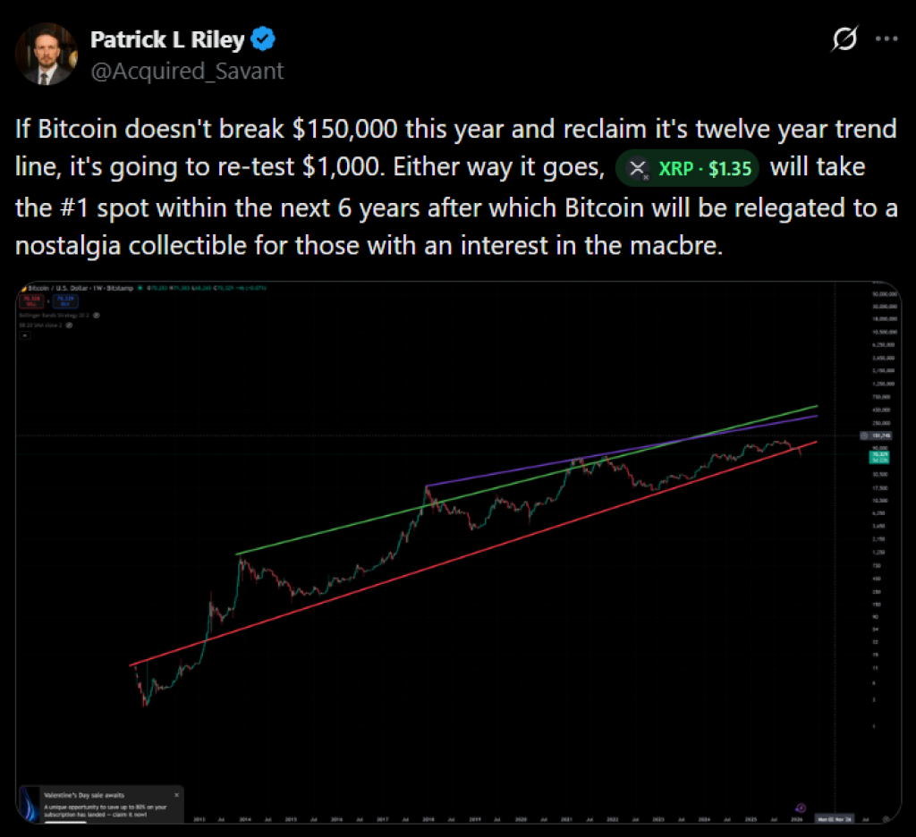 Um comentário recente destacado pelo TheCryptoBasic centra-se em Patrick L. Riley, um veterano e empreendedor americano que acredita que o XRP pode superar o Bitcoin dentro de seis anos. Riley apresenta essa previsão num período em que tanto o desempenho de preço do Bitcoin quanto do XRP estão muito abaixo dos picos anteriores, o que torna a previsão ainda mais impressionante.