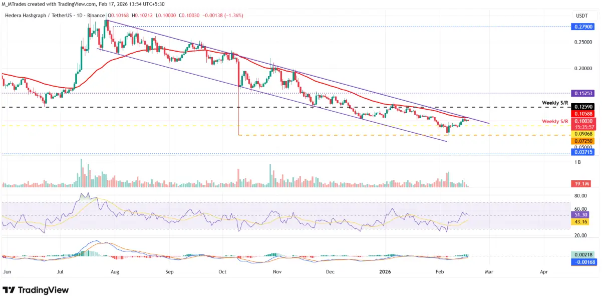 Gráfico diário do HBAR/USDT | Fonte: TradingViewEm termos de momentum, o índice de força relativa (RSI) no período diário oscila em torno de 51 e mostra sinais de enfraquecimento, aproximando-se da zona neutra de 50, refletindo uma perda gradual de força de compra. Para que a tendência de baixa seja realmente consolidada, o RSI precisa romper para baixo dessa zona neutra. Por outro lado, o indicador MACD ainda mantém um sinal de cruzamento de alta ativado desde 10 de fevereiro, indicando que a tendência de alta ainda não foi completamente invalidada.
