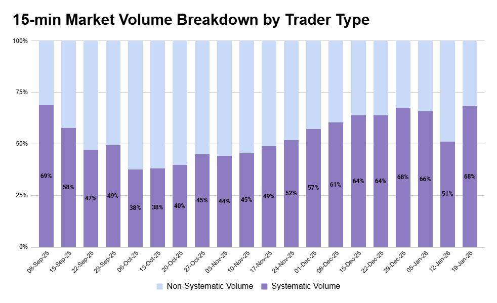 Fonte da imagem: Kunal Doshi Traders sistemáticos (Systematic Traders) contribuíram com 70% do volume de negociações em contratos de 15 minutos